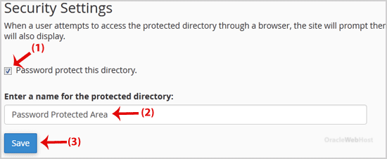 5. Under Security Settings, check the box next to the Password protect this directory and enter a name for the protected directory like Password Protected Area. Then click the Save button.
