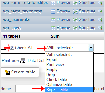 5. Scroll down and mark Check All then click on the Drop-down option and select Repair table.